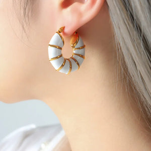 These hoops are crafted from high-quality stainless steel and plated with 18K gold, featuring a smooth white enamel coating that exudes a clean and modern aesthetic. The bright white enamel contrasts beautifully with the gold finish, creating a refined and sophisticated look. Whether you're looking to enhance your everyday style or add a polished touch to a special occasion outfit, these enamel hoops are a versatile and stylish choice.