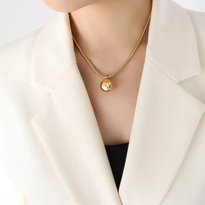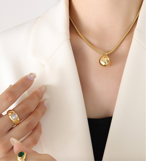 This neckpiece is crafted from durable stainless steel and plated with 18K gold, featuring a simple yet eye-catching design of polished gold balls evenly spaced along a delicate chain. The sleek and refined appearance makes it perfect for layering with other necklaces or wearing solo as a subtle statement. Whether you’re dressing up for an evening out or adding a touch of sophistication to your everyday look, this Gold Ball Neckpiece is the perfect finishing touch.