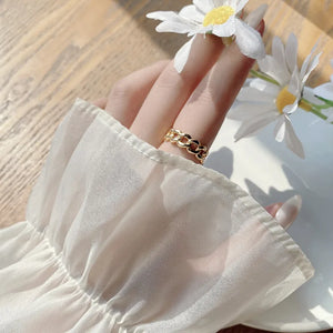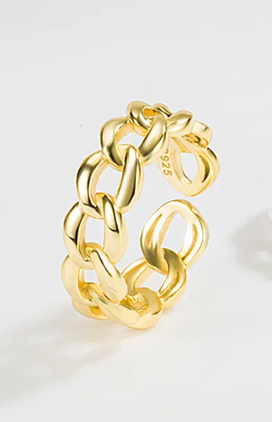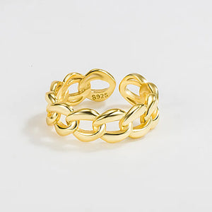 This ring features a chain-link design, plated with 18K gold over 304 stainless steel, creating a sleek and stylish look. The unique design makes it a perfect statement piece, whether worn alone or stacked with other rings. Its versatility and modern aesthetic make it an ideal accessory for those who appreciate chic and understated elegance.