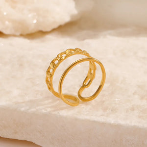 This message only appears in theme editor.A modern take on a classic design, the Gold Geometric Chain Ring features interlocking geometric shapes that create a contemporary look. Perfect for those who love unique, bold accessories.