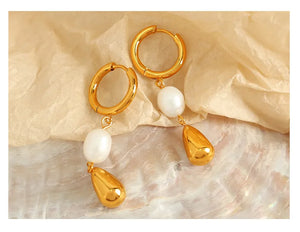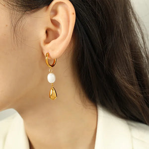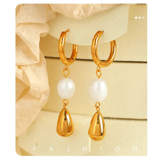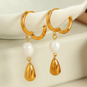 These earrings feature delicate pearls set in high-quality 304 stainless steel and plated with 18K gold. The combination of lustrous pearls and sleek design creates a refined look, perfect for adding a touch of timeless glamour to any outfit.