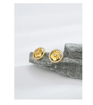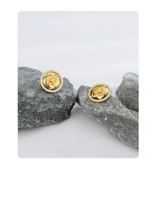 These studs feature intricately crafted rose designs, beautifully plated with 14-carat gold, symbolizing love and beauty. The exquisite details and high-quality craftsmanship make them a versatile accessory that complements any attire.