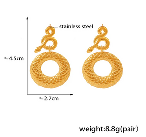 These earrings feature a sleek serpent design, intricately crafted from 18K gold-plated 304 stainless steel. The serpentine shape adds a touch of mystery and allure, making these earrings a perfect statement piece for those who love unique and daring jewelry.