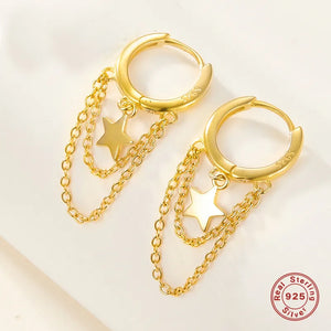 These earrings feature delicate star motifs, crafted from high-quality 925 sterling silver and plated with 18K gold. The radiant design adds a touch of celestial elegance to any ensemble, making these earrings a standout piece for both day and night.