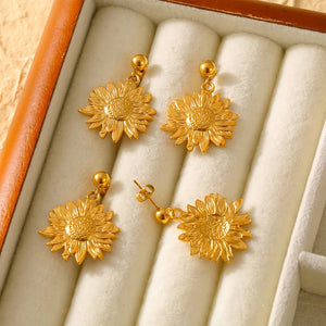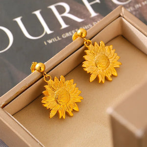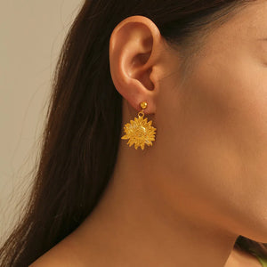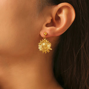 This message only appears in theme editor.Bring a bit of sunshine to your look with the Gold Sunflower Earrings. These radiant earrings feature intricately designed sunflower motifs, plated in gold for a warm, glowing finish. With their cheerful and nature-inspired design, these earrings are perfect for brightening up any outfit, whether for casual wear or formal events. The anti-tarnish gold plating ensures that they will maintain their shine and beauty for years to come.