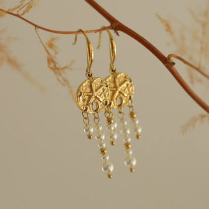 Crafted from high-quality stainless steel and plated with 18K gold, these earrings feature a unique wind chime-inspired design with cascading elements that mimic the gentle sway of chimes in a breeze. The intricate detailing and polished finish reflect light beautifully, creating a dynamic and eye-catching accessory. Perfect for adding a touch of sophistication and charm to any outfit, the Gold Wind Chime Earrings are a versatile choice for both everyday wear and special occasions.