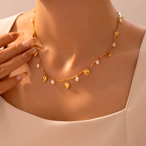 This neckpiece features a delicate peach-colored heart pendant, crafted from high-quality 304 stainless steel and plated with 18K gold. The soft hue and polished finish create a sophisticated look, perfect for adding a touch of romantic charm to any outfit.