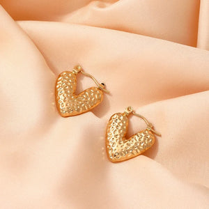 These hoops feature rugged heart motifs, crafted from high-quality 304 stainless steel and plated with 18K gold. The unique design and polished finish create a sophisticated look, perfect for adding a touch of bold style to any outfit.