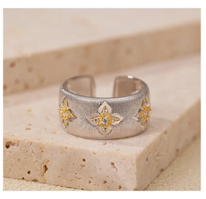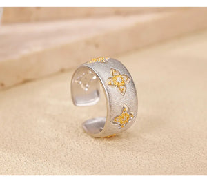 This ring features a clover motif inspired by the Van Cleef style, crafted from high-quality 925 sterling silver. The polished finish and intricate detailing create a sophisticated look, perfect for adding a touch of refined glamour to any outfit.