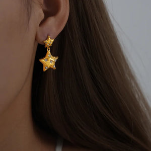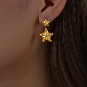 Crafted from high-quality Titanium Steel and plated with 18K gold, these earrings feature intricate star-shaped designs adorned with shimmering rhinestones. The brilliant sparkle and sophisticated design make them a perfect choice for both everyday wear and special occasions. Whether you're dressing up for a night out or adding a touch of glamour to your daily look, the Star Rhinestone Earrings are sure to make you shine.