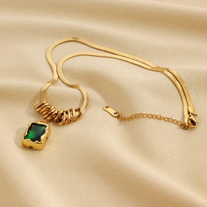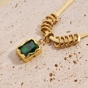 This neckpiece is crafted from high-quality stainless steel, plated with 18K gold, and features a striking green gemstone pendant. The rich green hue of the gemstone, paired with the luxurious gold finish, creates a captivating contrast that is both eye-catching and elegant. Perfect for adding a fun and fresh touch to your ensemble, the Green Candy Neckpiece is a must-have for those who love to stand out.