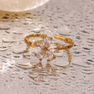 This message only appears in theme editor.Embrace the beauty of nature with the Zircon Five Petal Ring, a delicate piece inspired by blooming flowers. This ring features five meticulously crafted petals adorned with dazzling zircon stones, creating a radiant and feminine design.